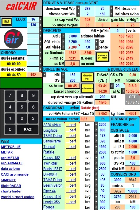 Utilitaire de calcul de navigation aérienne (pour simulateur) sous Excel, paramètrable & modifiable pour personnalisation.